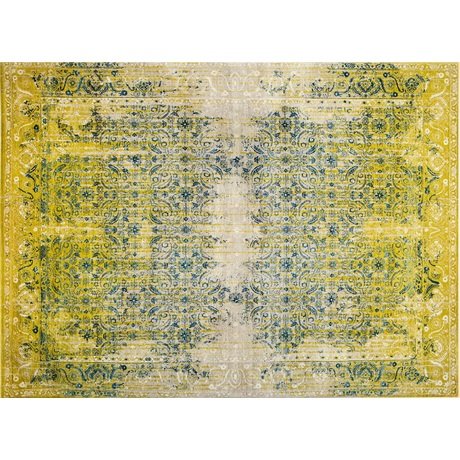 Ковер выполнен в современном стиле и искусственно состарен. Декор ковра имитирует старинные растительные принты. Сочный фон ковра цвета спелого лайма, утонченно вытертый по краям, изящно подчеркивает орнамент глубокого синего цвета.